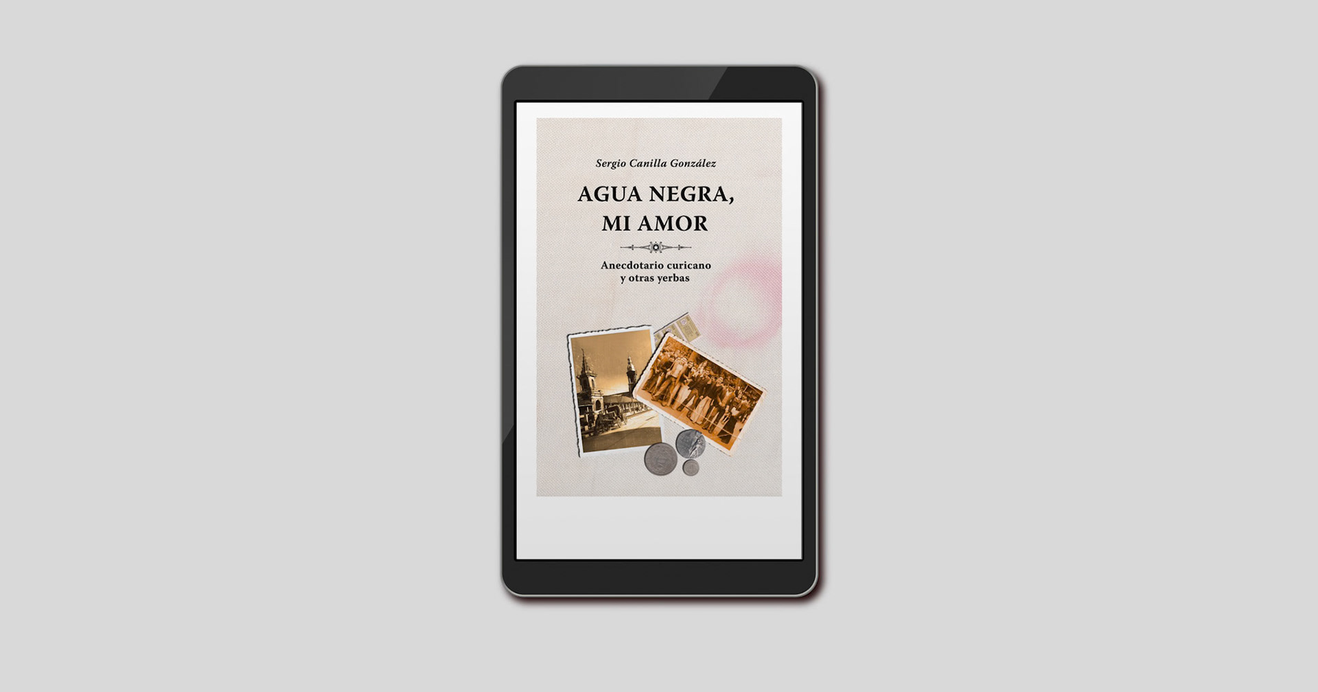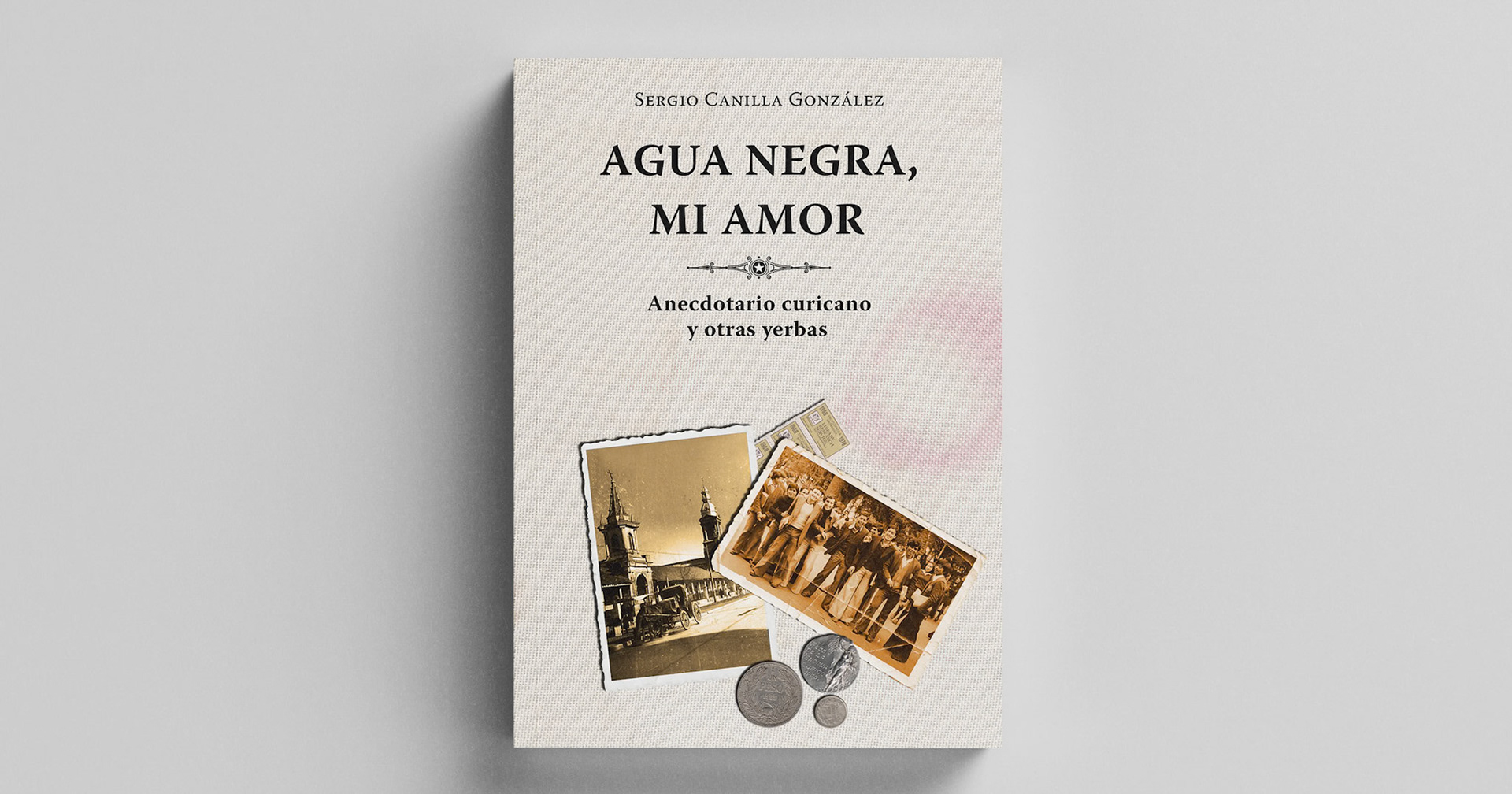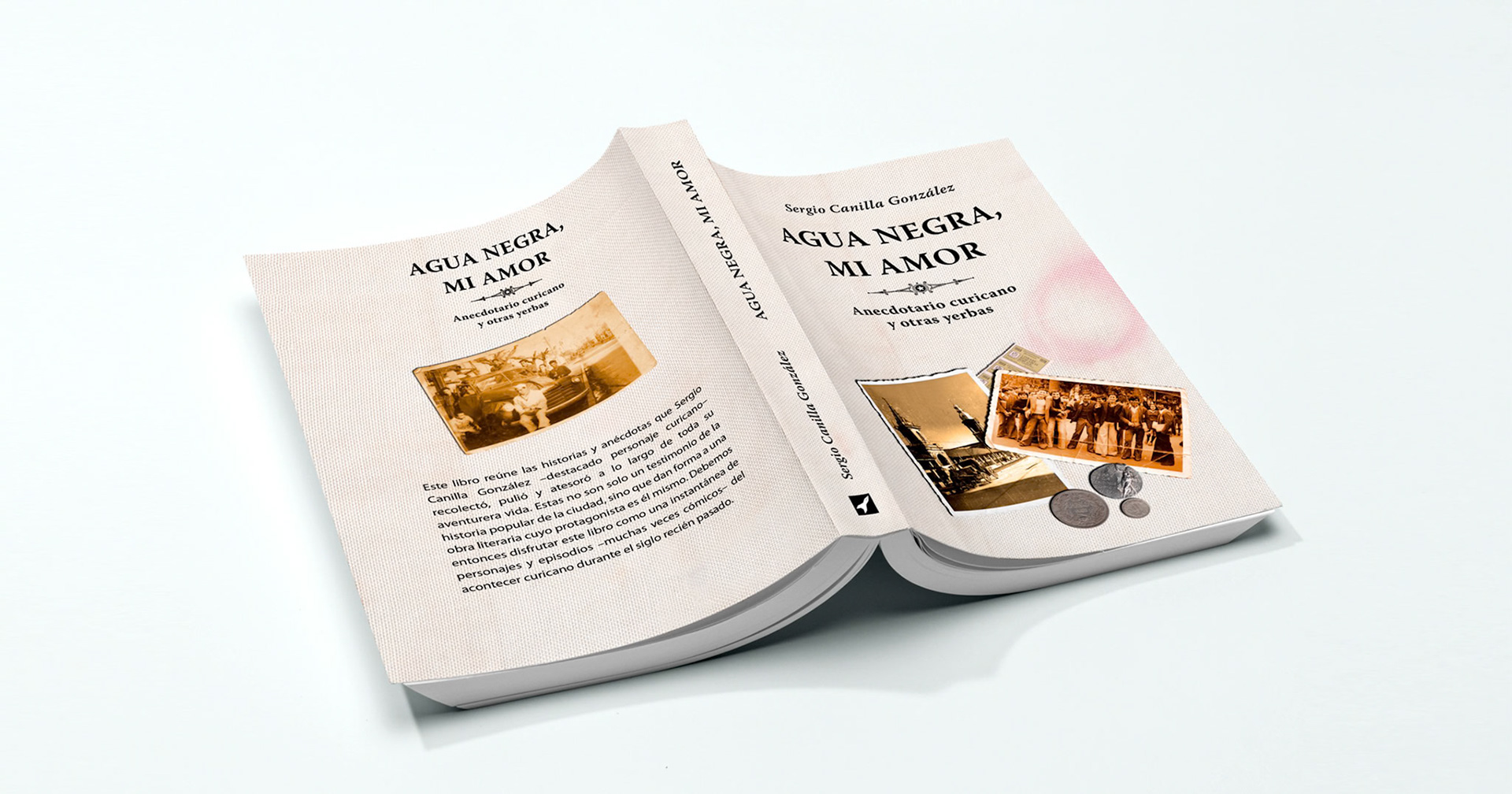 En Agua negra, mi amor el autor reúne a través de cinco capítulos los aspectos más atractivos de la vida de la ciudad. En la cubierta utilicé antiguas fotografías de la ciudad de Curicó, con lugares y actividades donde se desarrollan los distintos relatos que componen la obra.
