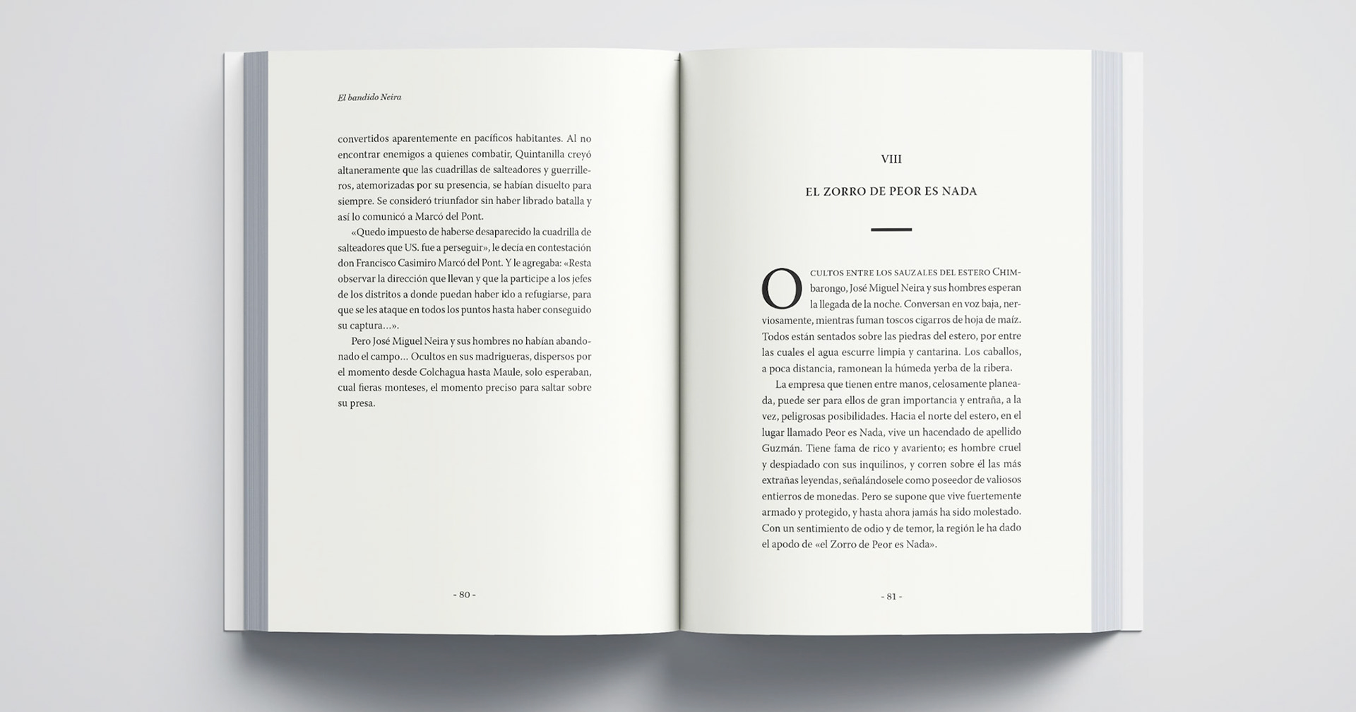 EL bandido Neira es una novela histórica que relata la vida del famoso bandolero chileno José Miguel Neira. En la tapa utilicé una ilustración del personaje en Los Cerrillos de Teno, —lugar al que pertenecía—. En las páginas de agradecimiento coloqué un mapa de la época en que el protagonista asolaba el territorio.