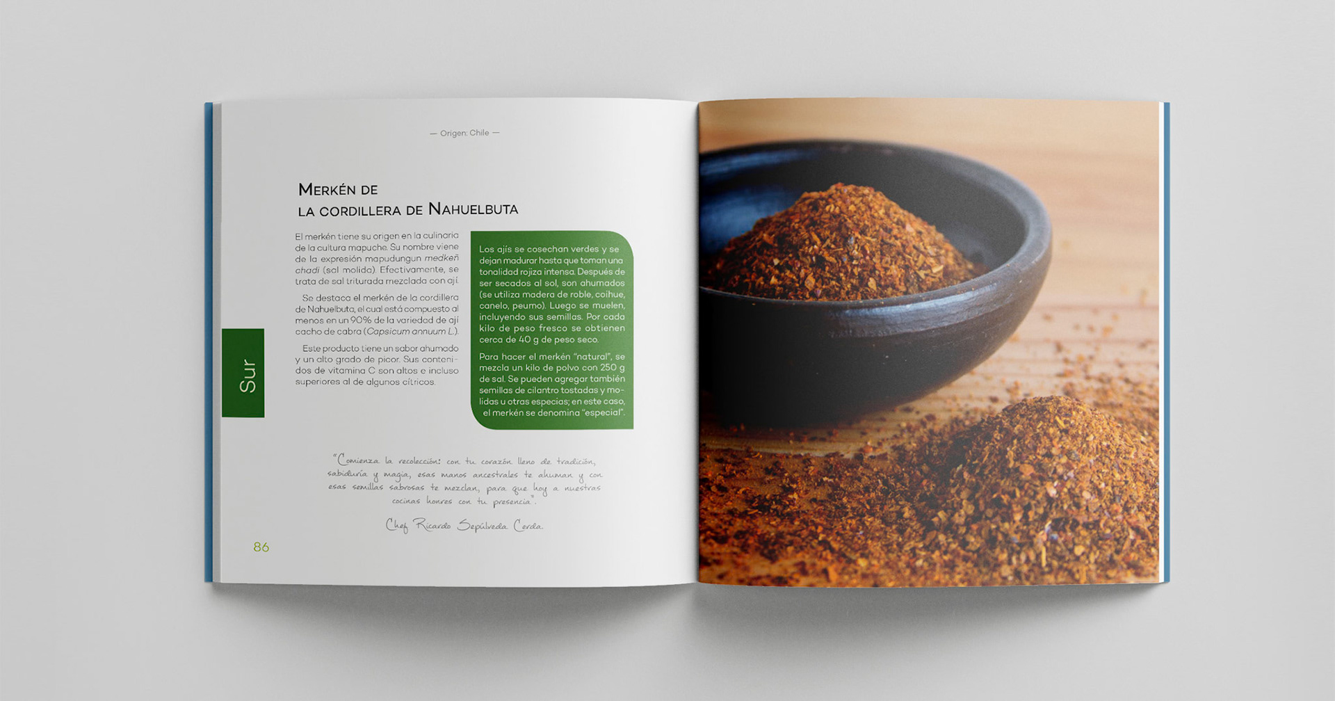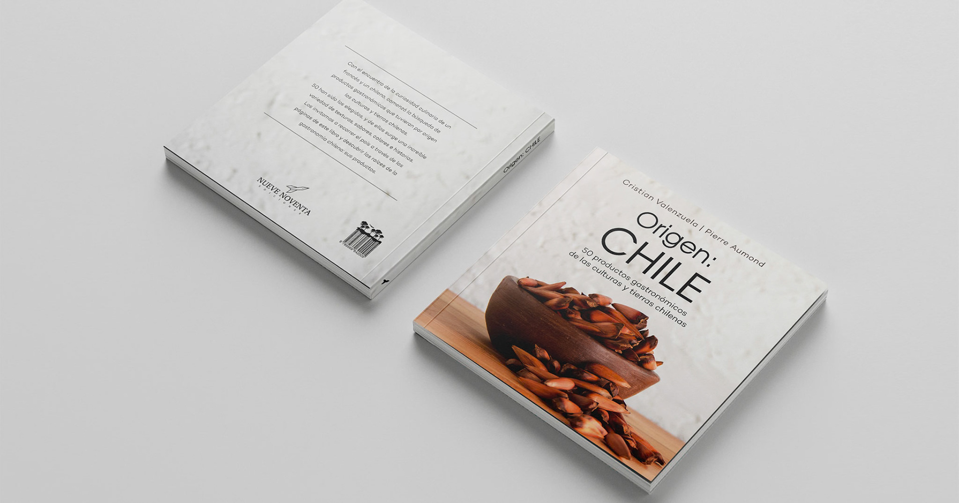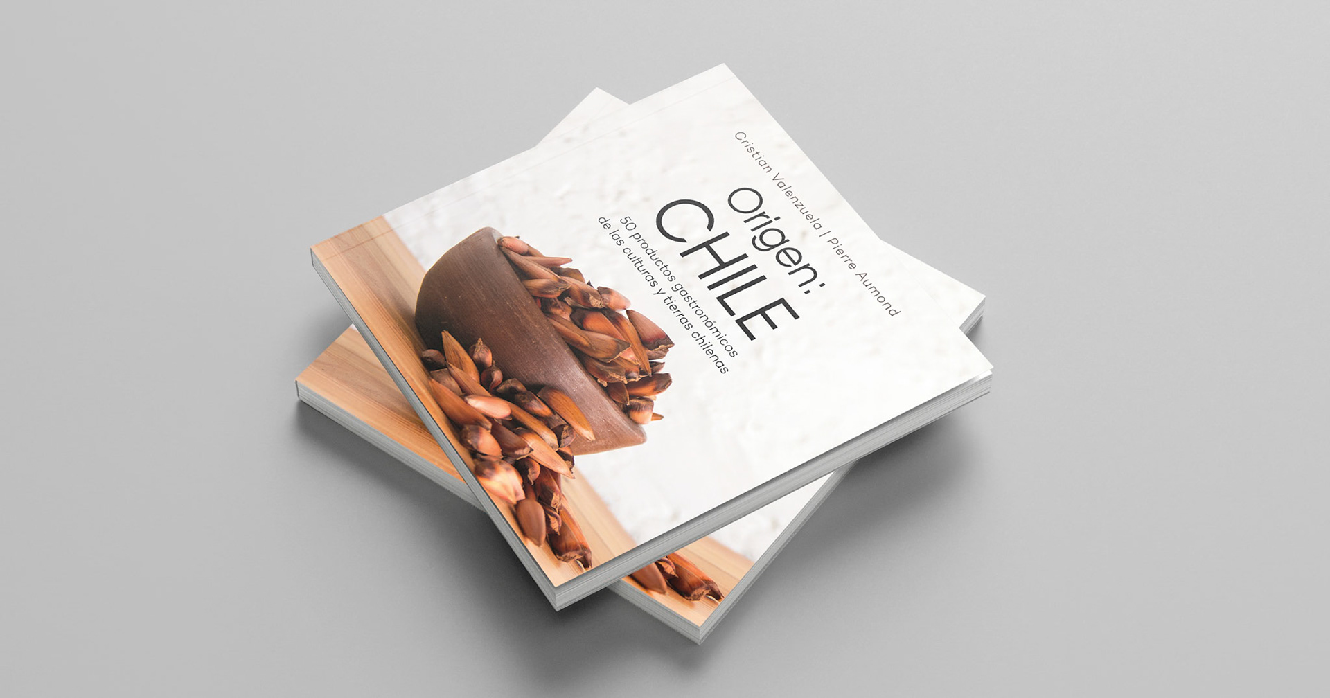 Origen: Chile. 50 productos gastronómicos de las culturas y tierras chilenas es un libro que reúne 50 productos del territorio con denominación de origen. Según la opinión de los Chefs más destacados de Chile, el piñón, fruto de la araucaria, es el producto gastronómico que mejor define al país, razón por la cual hice una fotografía de éste fruto para utilizarla en la cubierta del libro.